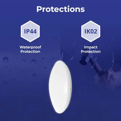 Un elemento importante delle plafoniere e delle applique LED è il loro livello di proezione IP, che indica la protezione contro l'ingresso di polvere e umidità/acqua. A partire da IP65, un apparecchio di illuminazione è a prova di polvere e acqua. Il valore IP di questa plafoniera LED è: IP44. Stai cercando una plafoniera LED per esterni? Allora presta attenzione alla protezione da urti e impatti, ovvero il valore IK, che per questa lampada è IK02 - 0.20 Joule.