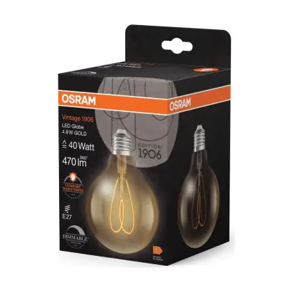 La Osram Vintage 1906 LED E27 Globe Filamento Oro 4.9W 470lm - 922 Bianco Molto Caldo | Miglior Resa Cromatica - Dimmerabile - Sostitutiva 40W è la perfetta sostituzione per la tua lampada convenzionale 40W con attacco E27 grazie alla sua tecnologia LED. Passare a LED ti offrirà tanti vantaggi!