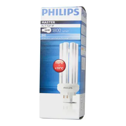 Le Philips PL-T TOP 26W 840 4P (MASTER) sono lampade fluorescenti compatte veramente efficienti dal punto di vista energetico in quanto consumano poca energia e sono caratterizzate da una vita media incredibilmente lunga. La base di queste lampade fluorescenti a basso consumo é del tipo GX24q-3 a 4 pin (perni). La potenza delle medesime é pari a 26W. Quando decidi di sostituire le tue vecchie lampade fluorescenti compatte, é di estrema importanza mantenere medesima base, numero di pin (perni) e stessa potenza: se anche uno solo di questi parametri é differente dalle tue lampade originali, con tutta probabilità non riuscirai a procedere con l'installazione.
