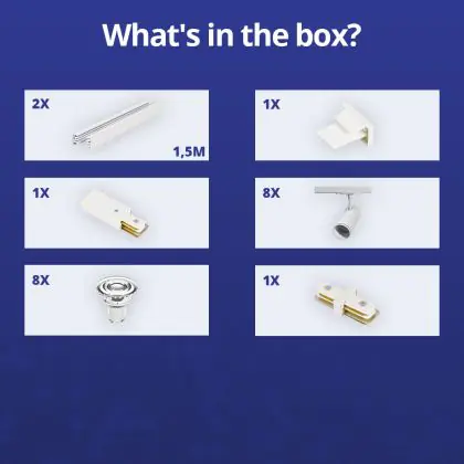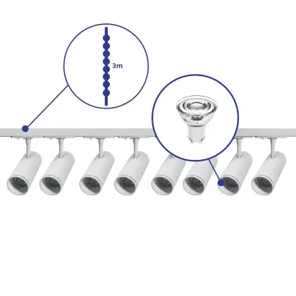 Descrizione Set completo 1-Fase Rail 3 Metro Bianca | incl. 8x Faretti + GU10 2700K 3W Dimmerabile + Tappo Di Chiusura, Connettore di Alimentazione e I-Connettore