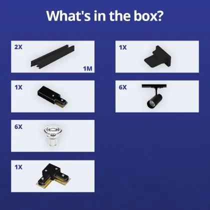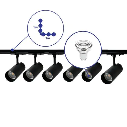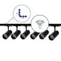 Descrizione Set completo 1-Fase Rail L 1 x 1 Metro Nero | incl. 6x Faretti + GU10 2700K 3W Dimmerabile + Tappo Di Chiusura, Connettore di Alimentazione e L -Connettore